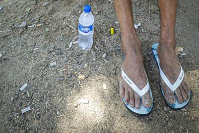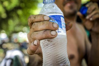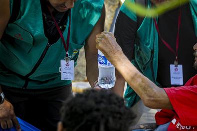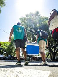 Porto Alegre, RS, Brasil, 06/02/2026: A abordagem social acontece diariamente, com equipes presentes nas ruas da cidade. Em períodos de calor extremo, o trabalho é intensificado para reduzir riscos à saúde das pessoas em situação de rua. A entrega de água gelada e chinelos é cuidado imediato para esse público. Foto: Alex Rocha/PMPA