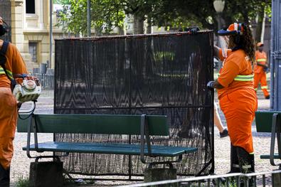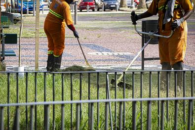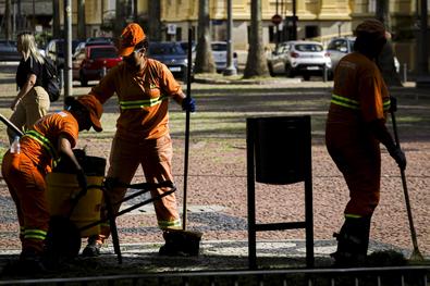 Porto Alegre, RS, Brasil, 19/02/2026: Equipes da prefeitura realizam serviços de capina na Praça da Alfândega, bairro Centro Histórico, na manhã desta quinta-feira (19). Foto: Alex Rocha/PMPA