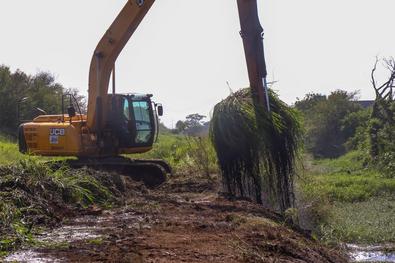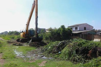 Porto Alegre, RS. 04/02/2026. DMAE realiza a retirada de macrófitas do canal da Estação de Bombeamento de Águas Pluviais n°10, no bairro Sarandi.