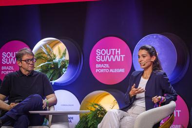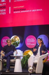 Porto Alegre, RS, Brasil, 25/03/2026: Na tarde desta quarta-feira (25), no espaço Arena Stage do South Summit Brazil 2026, foi realizado o Painel Como as plataformas liberam novas oportunidades, com a diretora-geral Brasil na Uber, Silvia Penna, e o cofundador do NeoFeed, Ralphe Manzoni Jr. Foto: Alex Rocha/PMPA