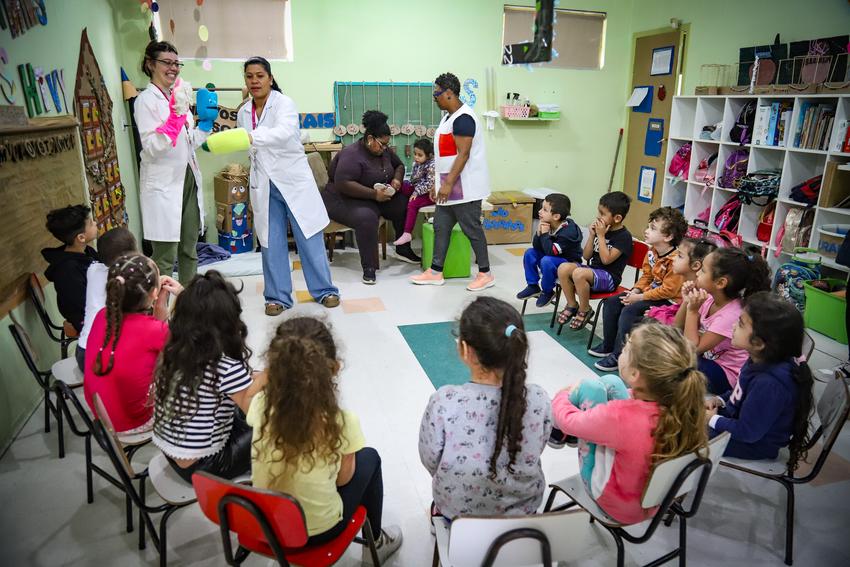 Porto Alegre, RS, 01/09/2025 A equipe de saúde bucal da unidade de saúde Assis Brasil, que atende usuários da unidade de saúde Jenor Jarros, junto com os agentes comunitários de saúde (ACS) desta última, em visita as crianças da Escola Conveniada de Educação Infantil (ECEI) Dutra Jardim, bairro Rubem Berta. A escola faz parte do território atendido pela US Jenor Jarros. Na ocasião a equipe fez atividades com músicas e materiais lúdicos em forma de escova de dentes, fio dental e a "vilã" cárie para falar sobre cuidados com a saúde bucal do pequenos de forma divertida. Além disso foi realizada oficina prática de escovação de dentes e revisão simples, feita pela dentista presente, para detectar se alguma das crianças precisavam ir até a US para revisões mais completas ou mesmo algum tratamento. A atividade faz parte das atividade rotineiras do Programa de Saúde na Escola (PSE). Foto: Cristine Rochol/PMPA
