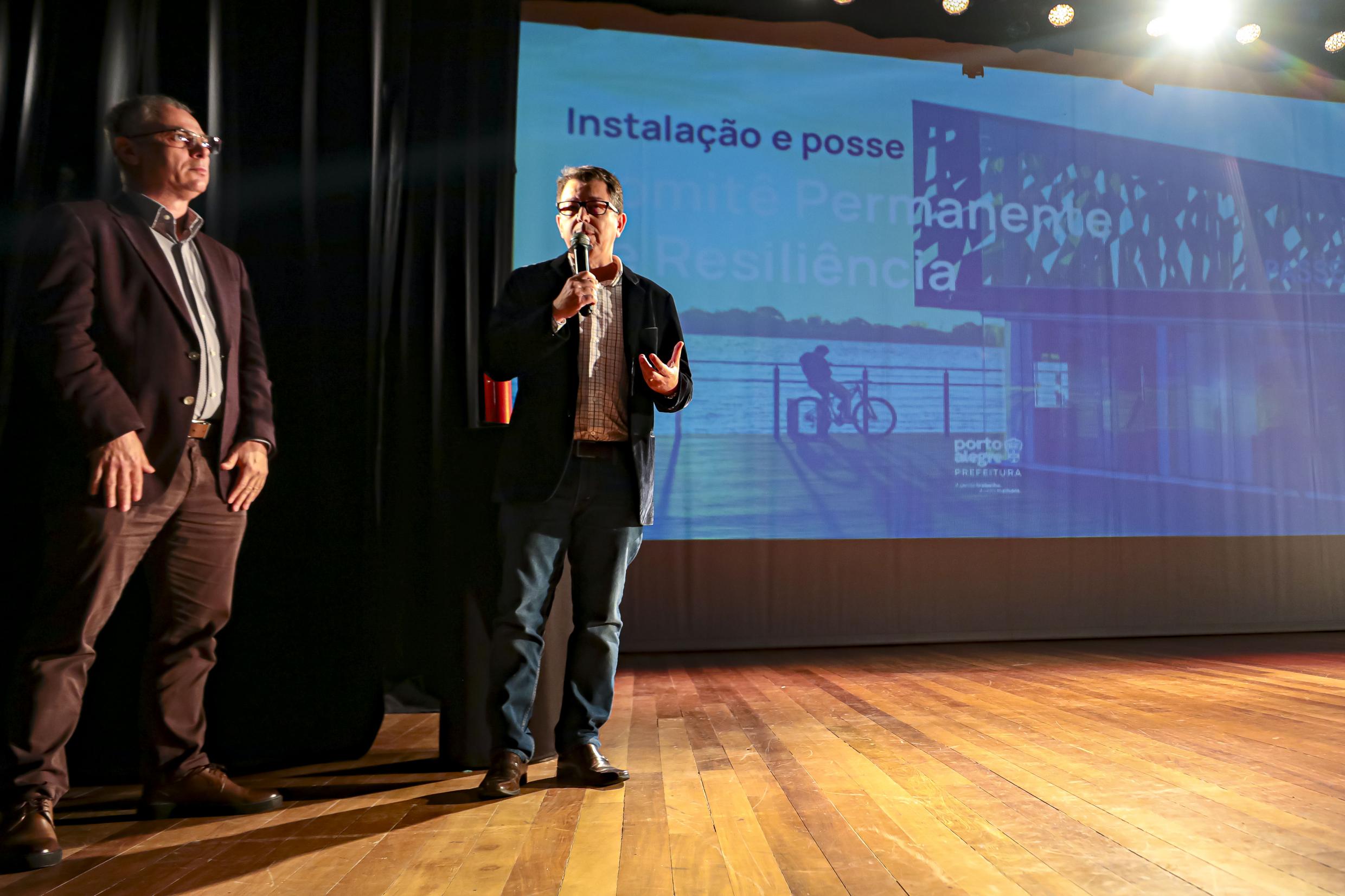 Porto Alegre, RS, Brasil, 22/9/2025: O prefeito Sebastião Melo participou da cerimônia de instalação do Comitê Permanente de Resiliência (CPR) da Capital nesta segunda-feira, 22, durante evento no Teatro de Câmara Túlio Piva, na rua da República, 575, bairro Cidade Baixa. Durante o ato, foram empossados os membros do CPR, que terão entre os seus objetivos atualizar a Estratégia Municipal de Resiliência de Porto Alegre. Foto: Alex Rocha/PMPA