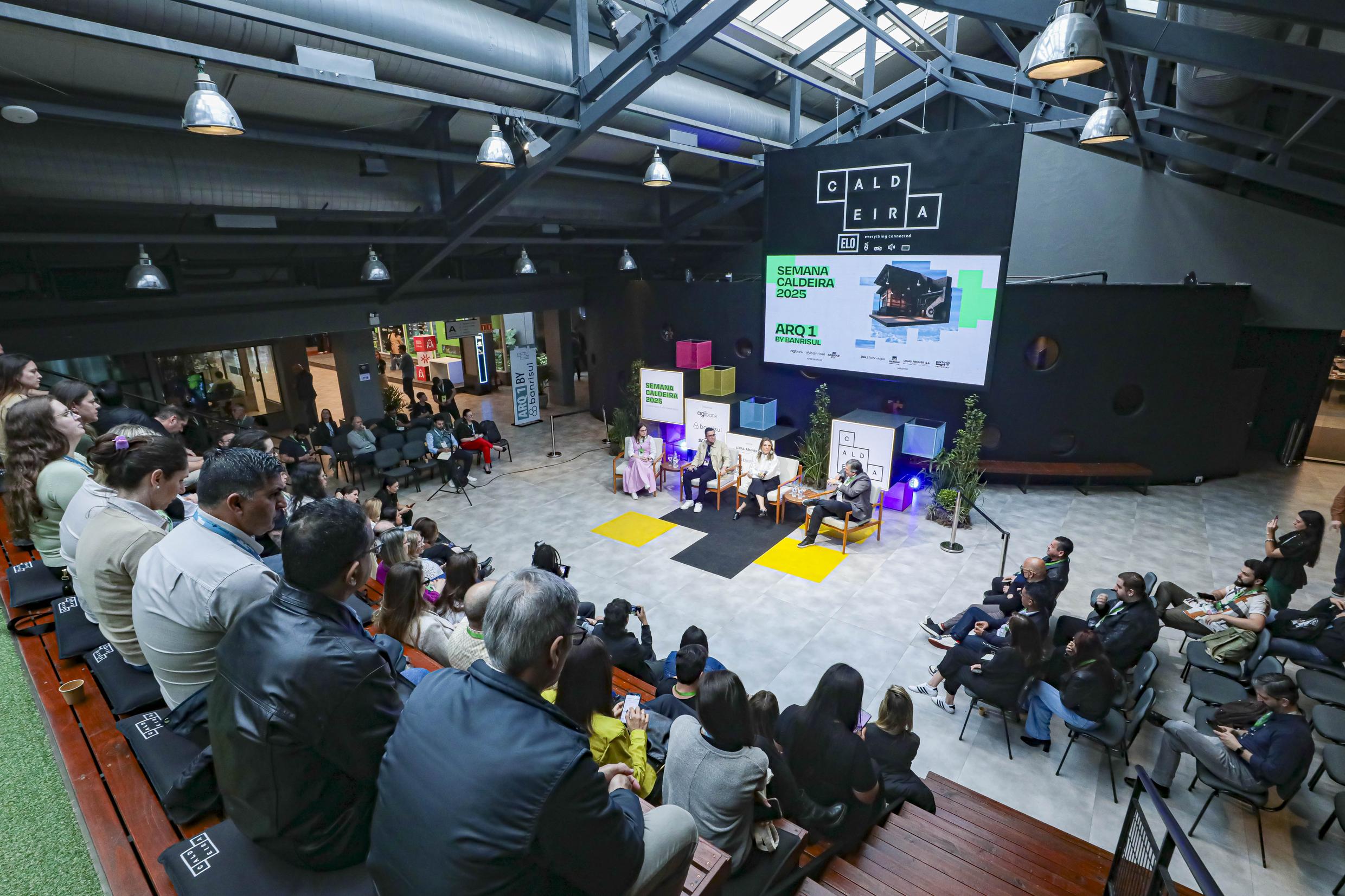 Porto Alegre, RS, Brasil, 30/9/2025: Na manhã desta terça-feira (30), ocorreu dentro da programação da Semana Caldeira 2025 a palestra " Inovação Aberta no Setor Público". O painel abordou as possibilidades e os desafios da inovação aberta aplicada ao setor público, explorando como o modelo Business to Government (B2G) pode gerar impacto positivo em políticas, serviços e na relação com a sociedade. A discussão destacou práticas que aproximam empresas, startups e governos na busca por soluções inovadoras, trazendo exemplos de casos concretos de contratação e parcerias já realizadas no setor público. Além de apresentar instrumentos e caminhos possíveis, o painel debateu como superar barreiras regulatórias e culturais, ampliando o espaço para iniciativas colaborativas que tragam eficiência, transparência e valor público. Foto: Alex Rocha/PMPA