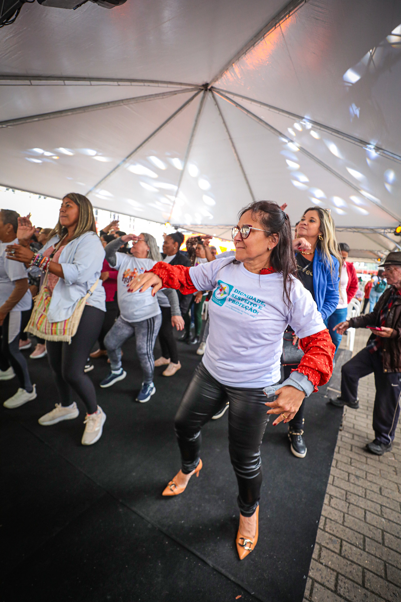 Porto Alegre, RS, Brasil, 01°/10/2025: Mês dedicado à valorização da pessoa idosa, outubro começou com uma programação gratuita e diversificada nesta quarta-feira, 1º, no Largo Glênio Peres, no Centro Histórico da Capital. O evento é promovido pela Secretaria Municipal da Inclusão e Desenvolvimento Humano (SMIDH), em parceria com a Secretaria Municipal de Assistência Social (SMAS), a Empresa Pública de Transporte e Circulação (EPTC) e outras instituições. Foto: Alex Rocha/PMPA