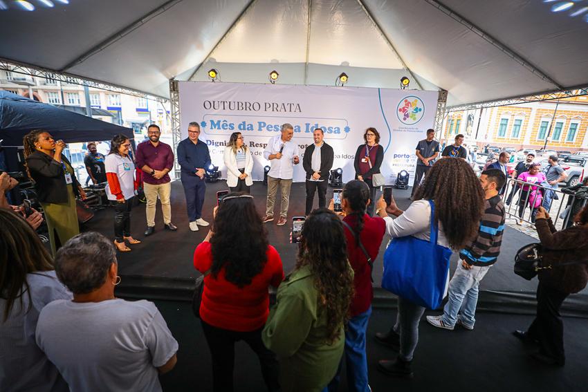 Porto Alegre, RS, Brasil, 01°/10/2025: Mês dedicado à valorização da pessoa idosa, outubro começou com uma programação gratuita e diversificada nesta quarta-feira, 1º, no Largo Glênio Peres, no Centro Histórico da Capital. O evento é promovido pela Secretaria Municipal da Inclusão e Desenvolvimento Humano (SMIDH), em parceria com a Secretaria Municipal de Assistência Social (SMAS), a Empresa Pública de Transporte e Circulação (EPTC) e outras instituições. Foto: Alex Rocha/PMPA