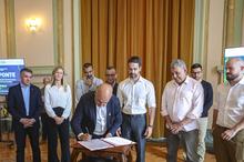 Porto Alegre, RS, Brasil, 02/10/2025: Na tarde desta quinta-feira (02), o prefeito Sebastião Melo e o governador Eduardo Leite assinaram um convênio que garante a liberação de R$ 9,9 milhões do programa Estadia Ponte. A medida irá viabilizar o reassentamento de famílias impactadas pelas obras da nova ponte do Guaíba, a cargo do Departamento Nacional de Infraestrutura de Transportes (Dnit). O evento foi realizado no Salão Alberto Pasqualini, do Palácio Piratini. Foto: Alex Rocha/PMPA