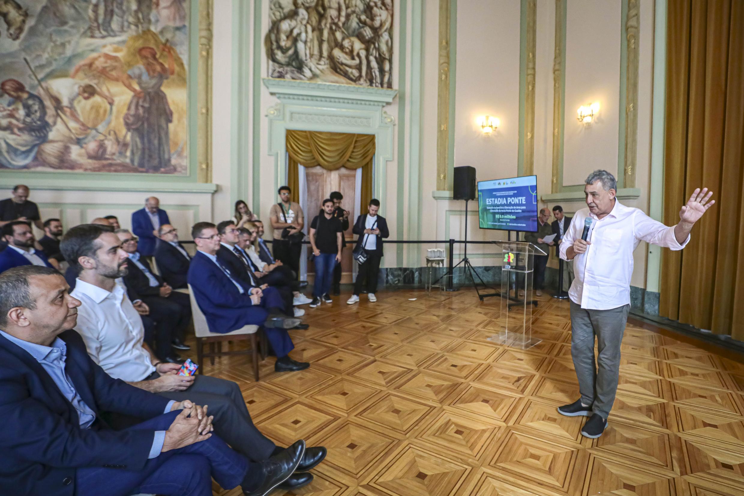 Porto Alegre, RS, Brasil, 02/10/2025: Na tarde desta quinta-feira (02), o prefeito Sebastião Melo e o governador Eduardo Leite assinaram um convênio que garante a liberação de R$ 9,9 milhões do programa Estadia Ponte. A medida irá viabilizar o reassentamento de famílias impactadas pelas obras da nova ponte do Guaíba, a cargo do Departamento Nacional de Infraestrutura de Transportes (Dnit). O evento foi realizado no Salão Alberto Pasqualini, do Palácio Piratini. Foto: Alex Rocha/PMPA