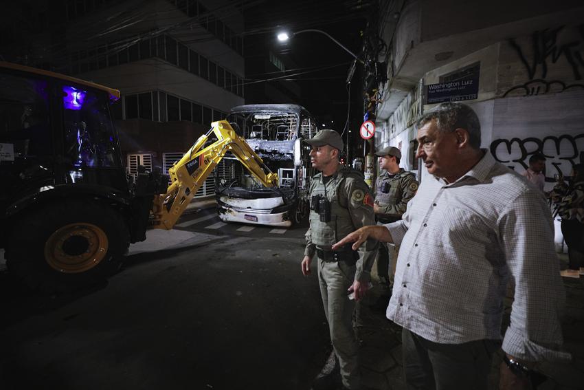 Porto Alegre, RS, Brasil - 03/10/2025 - Prefeito Sebastião Melo junto das equipes de segurança e saúde da prefeitura de Porto Alegre, prestam assistência às vitimas do incêndio em ônibus no Centro Histórico. Local: Rua Espírito Santo. Fotos: Cesar Lopes/ PMPA