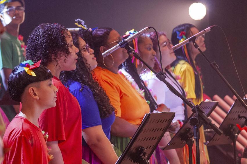 Porto Alegre, RS, Brasil, 09/10/2025: Concerto Tindolelê do Sons do Morro da EMEF Professora Judith Macedo de Araújo. O espetáculo foi realizado no Teatro Renascença, no bairro Menino Deus. Foto: Henry Rodrigues/SMED