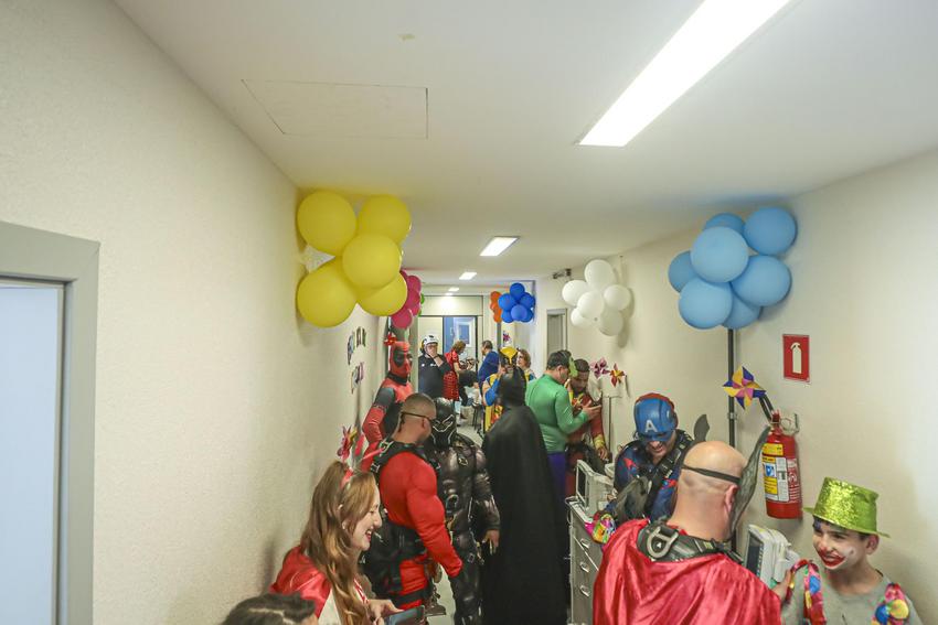 Porto Alegre, RS, Brasil, 10/10/2025: Crianças atendidas no Hospital Materno-Infantil Presidente Vargas (HMIPV) receberam uma visita especial nesta sexta-feira, 10. Do alto do 14º andar, alpinistas vestidos de super-heróis escalaram as paredes do prédio. A descida foi acompanhada por olhares atentos de funcionários e dos pequenos pacientes. A ação, alusiva ao Dia das Crianças, foi organizada pela psicopedagoga do Hospital, Juliana Pierdona, e contou com o apoio dos alpinistas voluntários da empresa M A Alpinismo Industrial, de Bento Gonçalves. A ação foi finalizada com a distribuição de brinquedos às crianças atendidas na pediatria e nas UTIs neonatal e pediátrica. Foto: Alex Rocha/PMPA