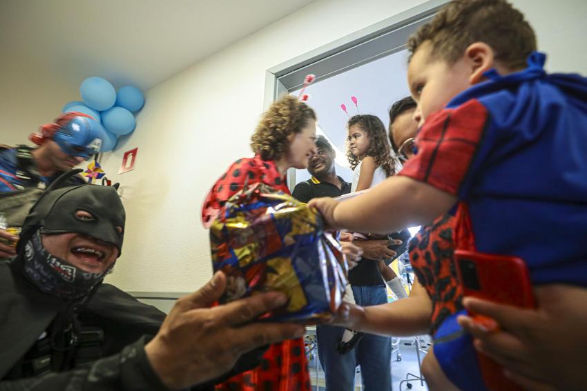 Porto Alegre, RS, Brasil, 10/10/2025: Crianças atendidas no Hospital Materno-Infantil Presidente Vargas (HMIPV) receberam uma visita especial nesta sexta-feira, 10. Do alto do 14º andar, alpinistas vestidos de super-heróis escalaram as paredes do prédio. A descida foi acompanhada por olhares atentos de funcionários e dos pequenos pacientes. A ação, alusiva ao Dia das Crianças, foi organizada pela psicopedagoga do Hospital, Juliana Pierdona, e contou com o apoio dos alpinistas voluntários da empresa M A Alpinismo Industrial, de Bento Gonçalves. A ação foi finalizada com a distribuição de brinquedos às crianças atendidas na pediatria e nas UTIs neonatal e pediátrica. Foto: Alex Rocha/PMPA