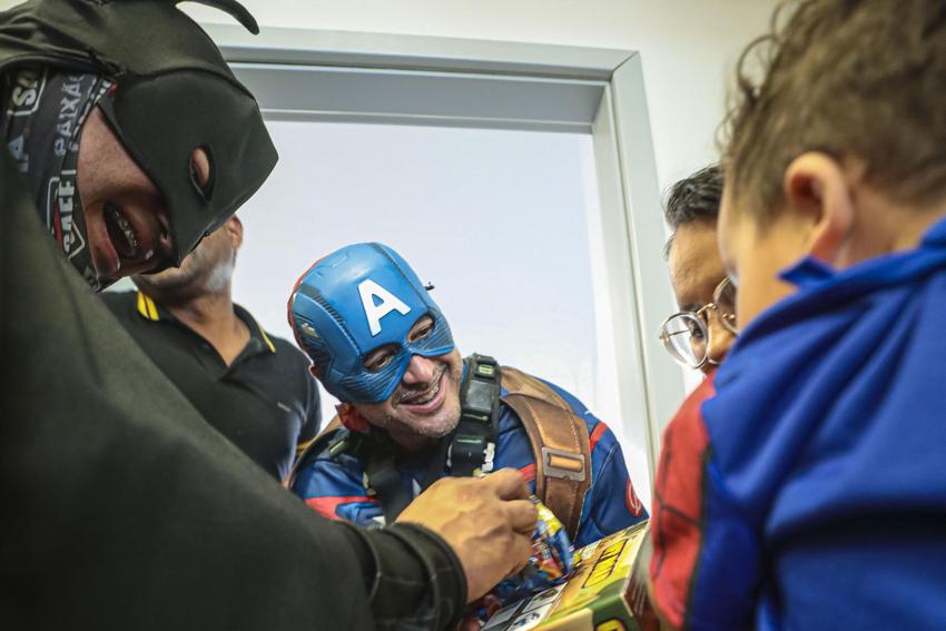 Porto Alegre, RS, Brasil, 10/10/2025: Crianças atendidas no Hospital Materno-Infantil Presidente Vargas (HMIPV) receberam uma visita especial nesta sexta-feira, 10. Do alto do 14º andar, alpinistas vestidos de super-heróis escalaram as paredes do prédio. A descida foi acompanhada por olhares atentos de funcionários e dos pequenos pacientes. A ação, alusiva ao Dia das Crianças, foi organizada pela psicopedagoga do Hospital, Juliana Pierdona, e contou com o apoio dos alpinistas voluntários da empresa M A Alpinismo Industrial, de Bento Gonçalves. A ação foi finalizada com a distribuição de brinquedos às crianças atendidas na pediatria e nas UTIs neonatal e pediátrica. Foto: Alex Rocha/PMPA