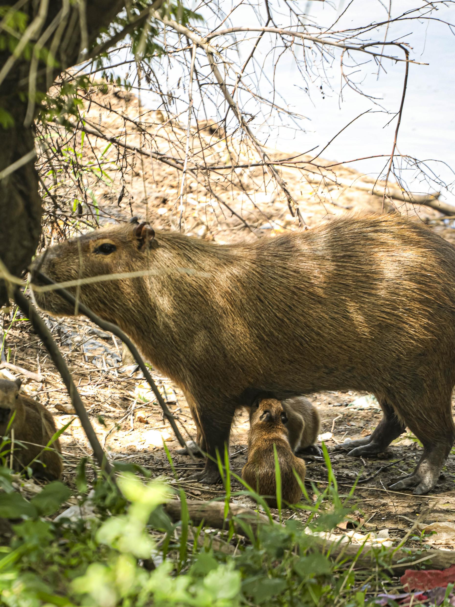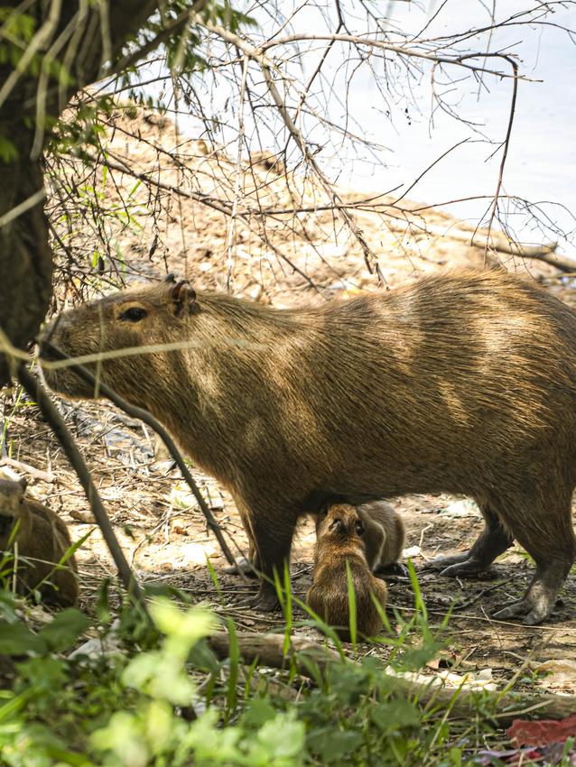 Porto Alegre, RS, Brasil, 11/10/2025: Na capital gaúcha, próximo ao Arroio Dilúvio, na altura do bairro Praia de Belas, as capivaras aumentaram sua família. Nas imagens, registro dos novos filhotes A capivara ou capincho, nome científico Hydrochoerus hydrochaeris, é uma espécie de mamífero roedor da família Caviidae e subfamília Hydrochoerinae. Ocorre por toda a América do Sul ao leste dos Andes em habitats associados a rios, lagos e pântanos, do nível do mar até 1 300 m de altitude. Extremamente adaptável, pode ocorrer em ambientes urbanizados. Foto: Alex Rocha/PMPA