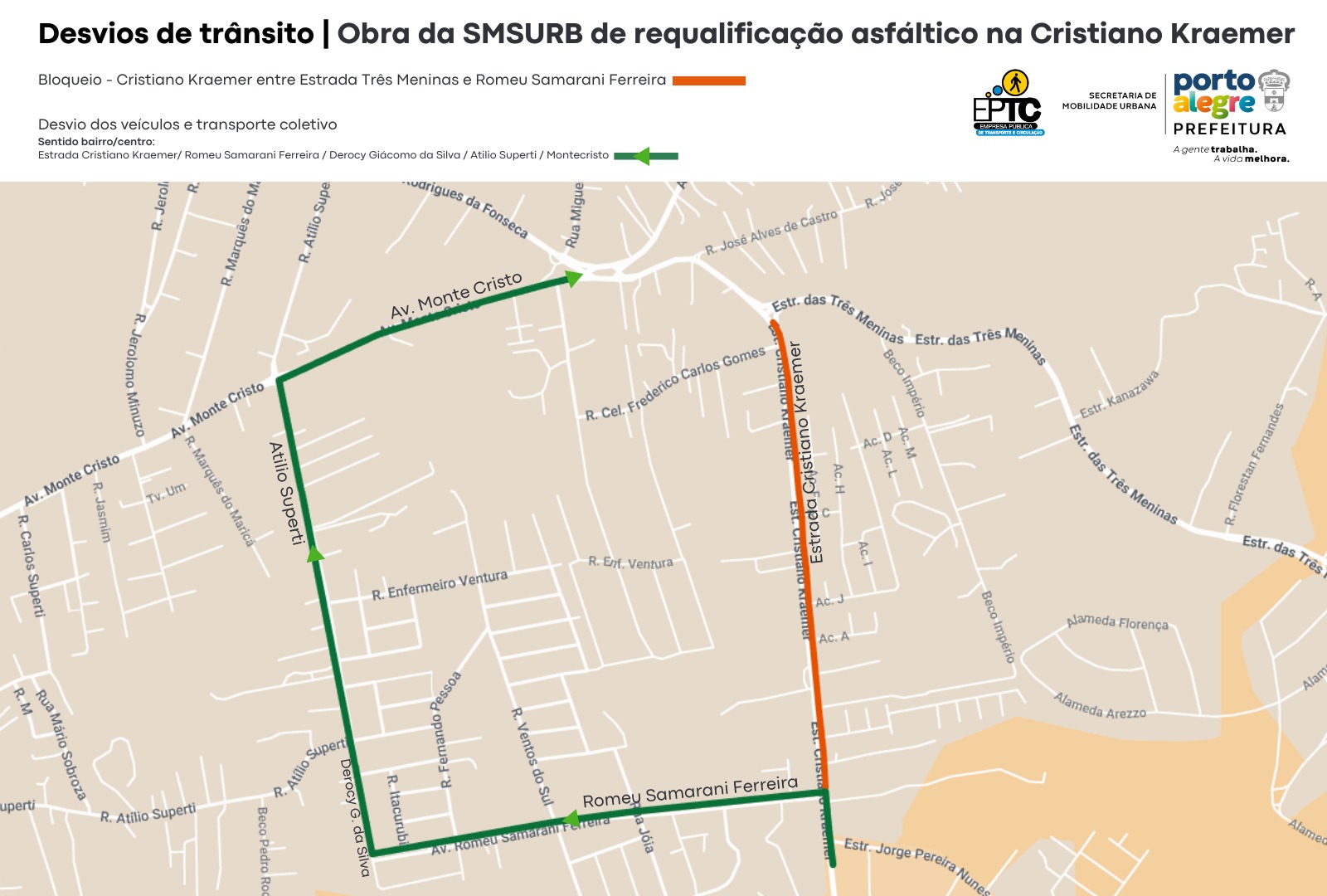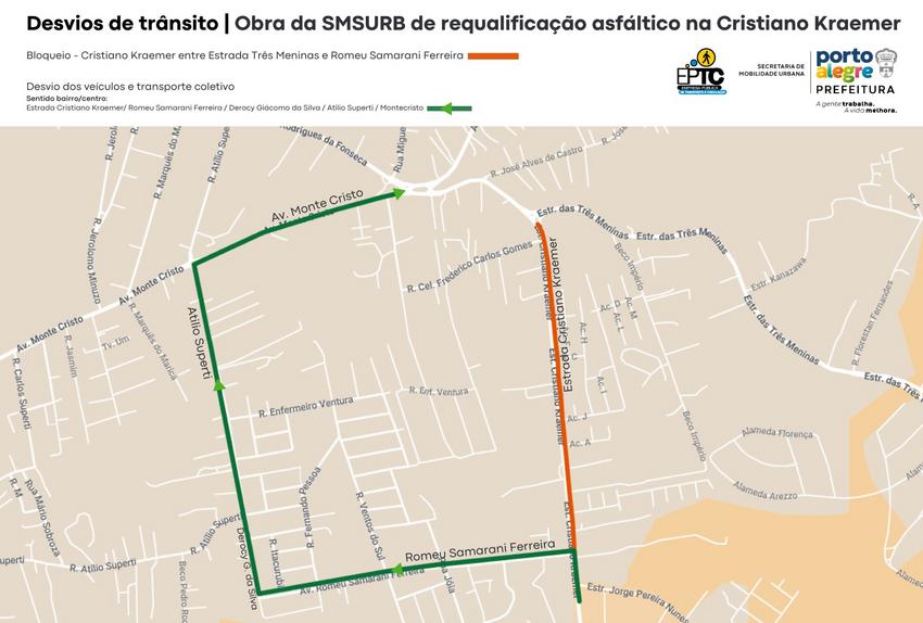 Porto Alegre, RS, Brasil, 11/10/2025: O trânsito na Estrada Cristiano Kraemer, no trecho entre a Estrada Três Meninas e a rua Romeu Samarani Ferreira, será bloqueado no sentido bairro-Centro a partir das 9h de segunda-feira, 13, até o final do dia de terça-feira, 14. A intervenção é necessária para a execução das obras de requalificação asfáltica realizadas pela Secretaria Municipal de Serviços Urbanos (SMSUrb). Foto: Arte Carlos Rohde/EPTC