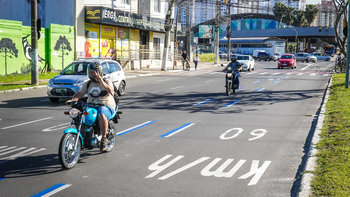 Porto Alegre, RS, Brasil - 10/10/2025: A Empresa Pública de Transporte e Circulação (EPTC) foi autorizada a implantar um projeto experimental de motofaixa de aproximadamente quatro quilômetros na avenida Assis Brasil, entre a avenida Joaquim Silveira, a partir do Terminal Triângulo, e a avenida Bernardino Silveira Amorim, no sentido Centro-bairro, próximo à Fiergs. A sinalização de faixa preferencial para circulação de motociclistas não está prevista no Código de Trânsito Brasileiro (CTB) e, por isso, depende de autorização específica da Secretaria Nacional de Transito (Senatran) para fins de estudo experimental. O objetivo do projeto é melhorar a circulação e reduzir os sinistros com envolvimento de motociclistas nesse trecho. Foto: Gustavo Roth/EPTC/PMPA