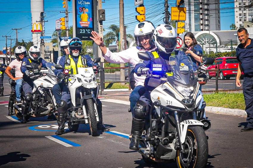 Porto Alegre, RS, Brasil, 14/10/2025: A Empresa Pública de Transporte e Circulação (EPTC) realizou nesta terça-feira, 14, a vistoria da nova sinalização implantada para a motofaixa da avenida Assis Brasil, na Zona Norte da Capital. O projeto foi implementado no sentido Centro-bairro da via, a partir do cruzamento com a avenida Joaquim Silveira, no bairro Sarandi. O prefeito Sebastião Melo, e o diretor-presidente da EPTC, Pedro Bisch Neto, acompanharam a agenda. Foto: Alex Rocha/PMPA