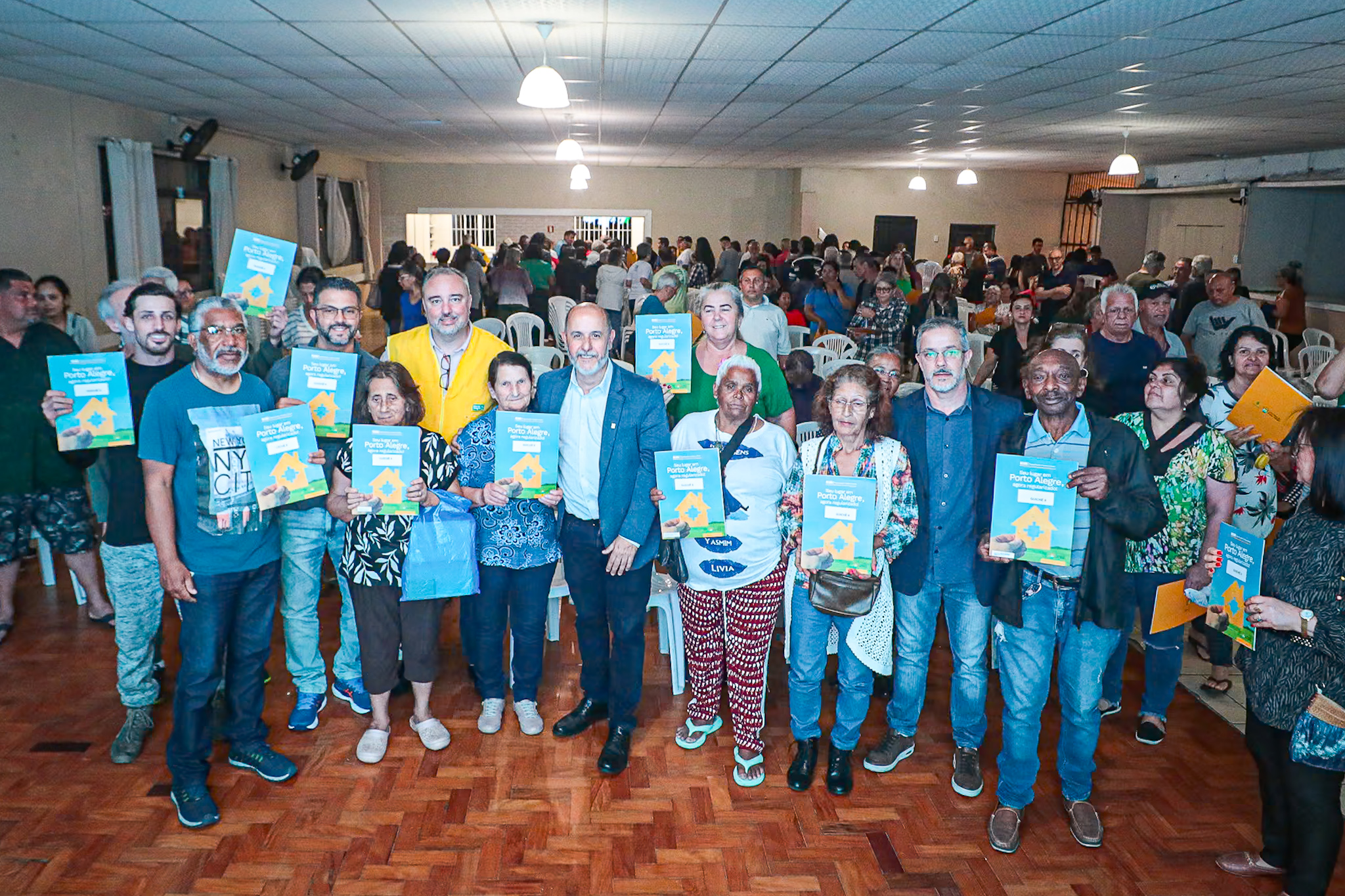Porto Alegre, RS, Brasil, 15/10/2025: O Departamento Municipal de Habitação (Demhab) realizou nesta quarta-feira, 15, a maior entrega de matrículas do ano, beneficiando 240 moradores no bairro Santa Rosa de Lima, na Zona Norte da Capital. O evento marca o início do processo de regularização fundiária urbana (Reurb) na localidade. A cerimônia aconteceu a partir das 18h30, no Salão Paroquial da Igreja Santa Rosa de Lima, na avenida Bernardino de Oliveira Paim, 82, e contou com as presenças do prefeito Sebastião Melo e do diretor-geral do Demhab, André Machado. Foto: Alex Rocha/PMPA