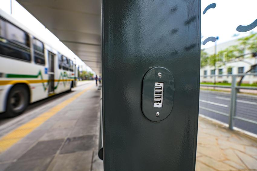 Porto Alegre, RS, 16/10/2025: Instalação dos novos abrigos de passageiros na avenida Osvaldo Aranha. As estruturas tem piso podotátil, espaço para cadeirantes, iluminação artificial, três tomadas USB e proteção para vento e chuva. Foto: Alex Rocha/PMPA