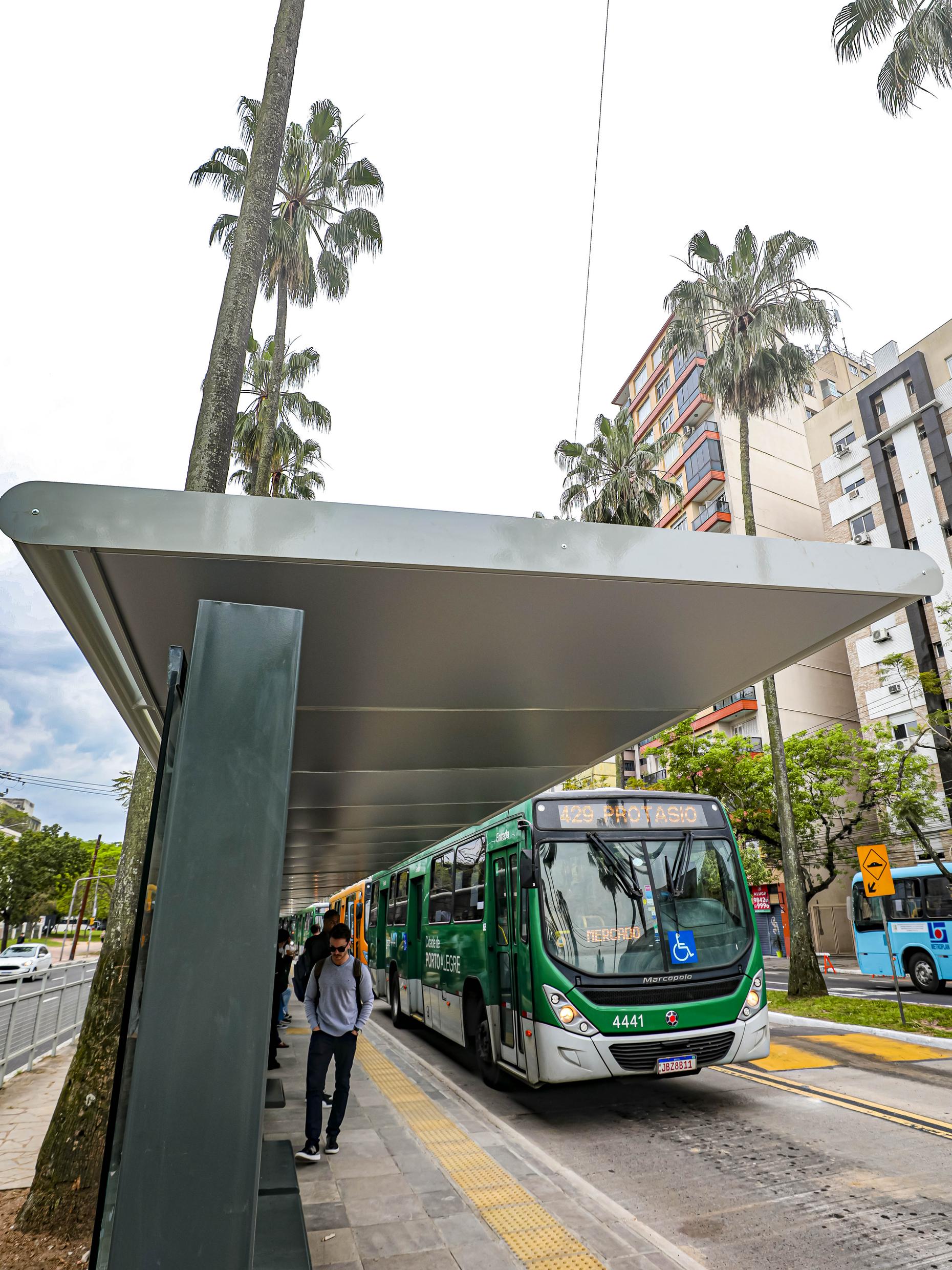 Porto Alegre, RS, 16/10/2025: Instalação dos novos abrigos de passageiros na avenida Osvaldo Aranha. As estruturas tem piso podotátil, espaço para cadeirantes, iluminação artificial, três tomadas USB e proteção para vento e chuva. Foto: Alex Rocha/PMPA