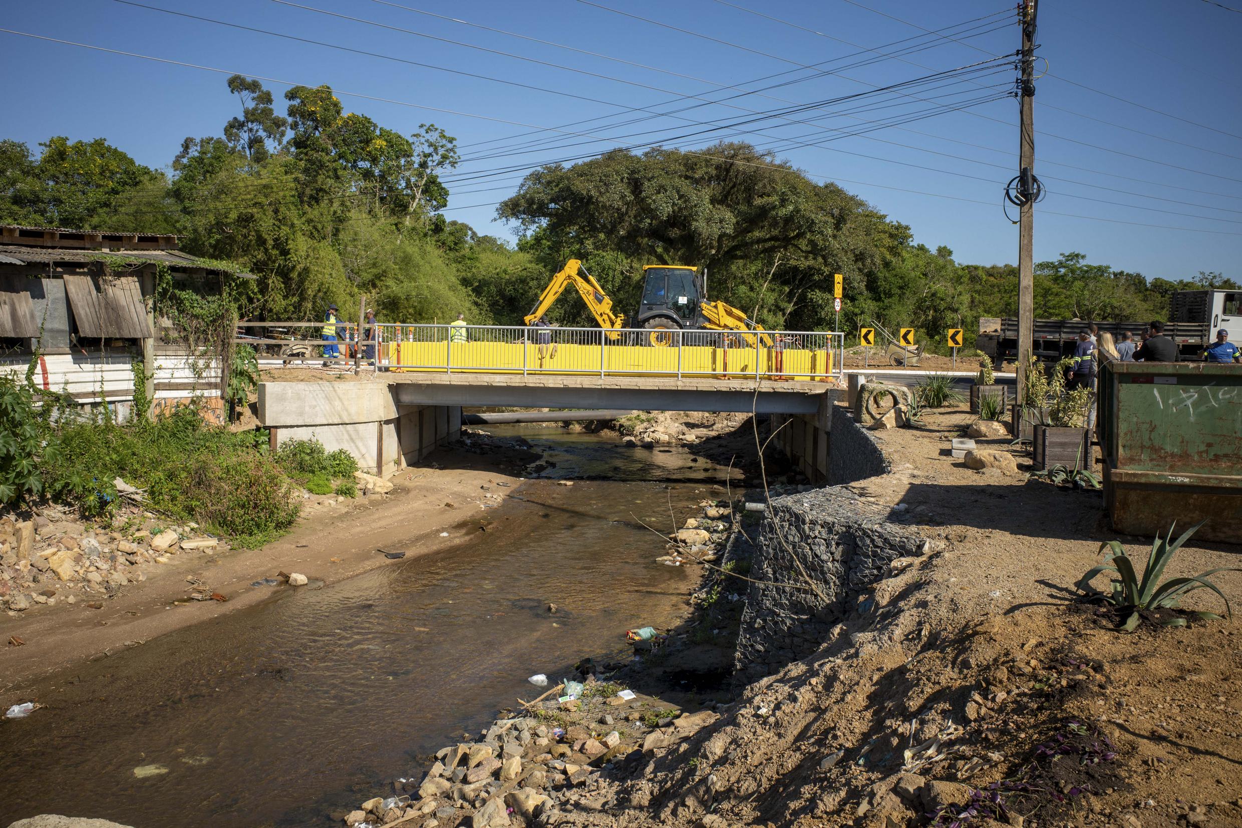 Porto Alegre, RS, Brasil, 15/10/2025: A nova Ponte do Salso e as obras de infraestrutura nas ruas do entorno foram entregues nesta quarta-feira, 15, no bairro Restinga, importante acesso entre as avenidas Costa Gama e Nilo Wulff. O trânsito no local será liberado após a sinalização das vias ser finalizada, nos próximos dias. O prefeito Sebastião Melo, acompanhado da vice-prefeita Betina Worm e do secretário de Serviços Urbanos, Vitorino Baseggio, realizou a vistoria para entrega das obras. Foto: Marcelo Viola/PMPA