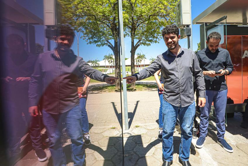 Porto Alegre, RS, Brasil, 22/10/2025: A Prefeitura de Porto Alegre, por meio da Secretaria de Mobilidade Urbana (SMMU), com apoio da Eletromidia e Claro, realizou nesta quarta-feira, 22, às 11h, a vistoria do primeiro ponto do abrigo amigo da cidade. O projeto transforma pontos de ônibus em locais de acolhimento, com possibilidade de acionamento de uma central de atendimento por vídeo. O primeiro ponto foi instalado na avenida Osvaldo Aranha, 909, bairro Bom Fim. No local, foi apresentado o funcionamento do sistema, além do impacto e os próximos passos da iniciativa na capital gaúcha. Foto: Alex Rocha/PMPA