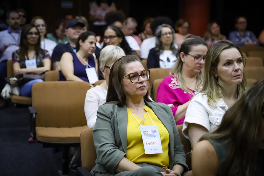Porto Alegre, RS, 24/10/2025 Secretaria Municipal de Saúde (SMS) realiza o I Seminário Municipal da Saúde da Pessoa com Deficiência: a inclusão é o plano, no salão nobre da UFCSPA. Mesa de abertura (esq. para dir.): representando a SMIDH, Willian Tempel, representando a SES/RS chefe da seção das Redes Políticas Transversais, Mariana Viana da Silva, a diretora-adjunta da DAPS/SMS, Caroline Ceolin, representando a UFCSPA, Núcleo de Inclusão, Luiza Maria de Oliveira Braga Silveira, o coord. adjunto do CMS de POA, Waldir Bonhgas e o pres. em exercício do Cons. Municipal dos Direitos da Pessoa com Deficiência de POA, Adilson Luis Pimetel Corlassoli.