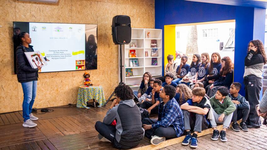 Porto Alegre,RS, Brasil - 31/10/2025: Contação de Histórias do livro: Eu Sou Nala para a EMEF Deputado Victor Issler. Local: Praça da Alfândega. Foto: Henry Rodrigues/SMED /PMPA
