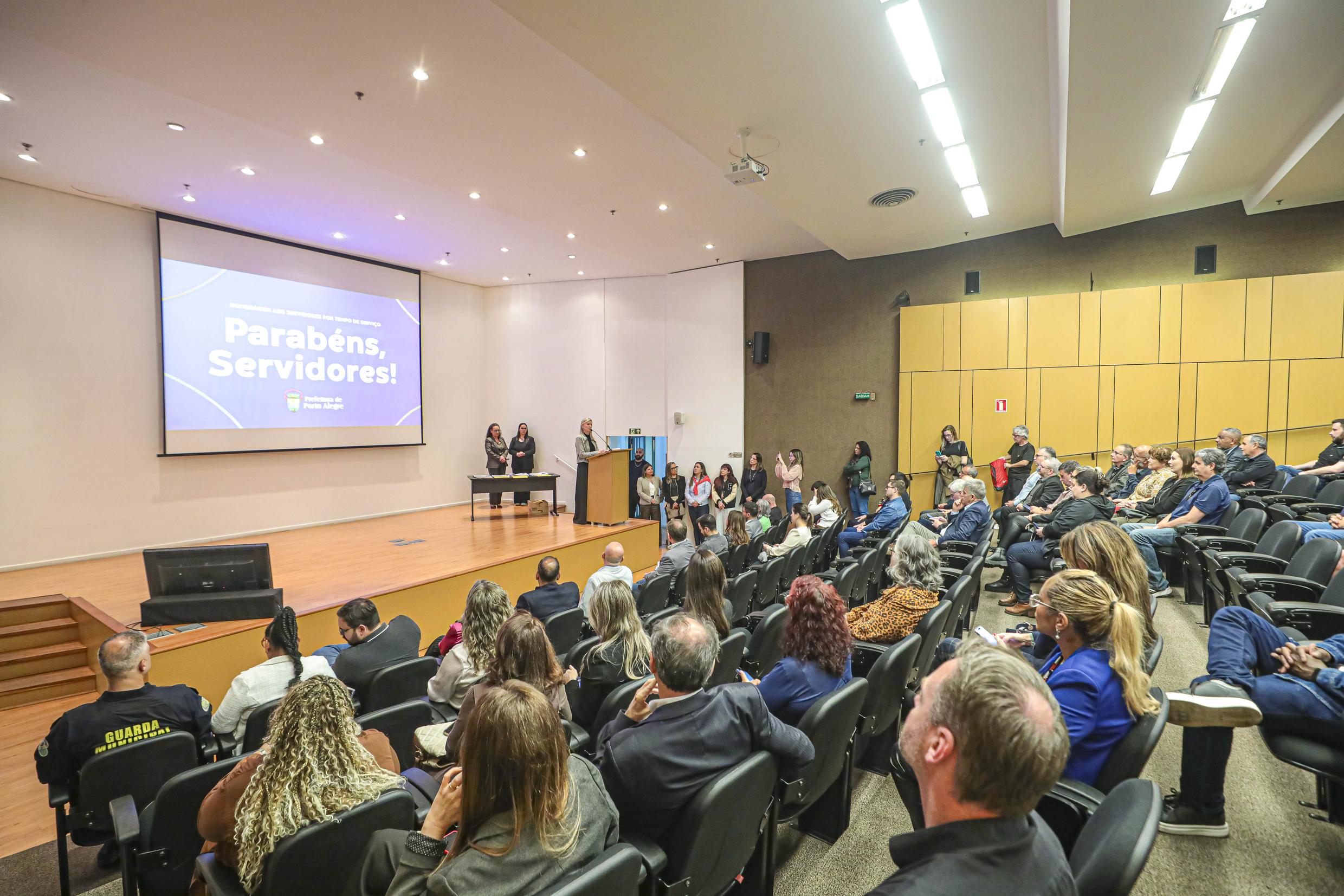 Porto Alegre, RS, Brasil, 31/10/2025: Em um evento que contou com a presença da vice-prefeita, Betina Worm, foi realizada na tarde desta sexta-feira (31), no auditório da Associação dos Auditores Fiscais da Receita Municipal de Porto Alegre (AIAMU), no bairro Centro Histórico, uma cerimônia para homenagear os servidores municipais pelo seu Tempo de Serviço. Foto: Alex Rocha/PMPA