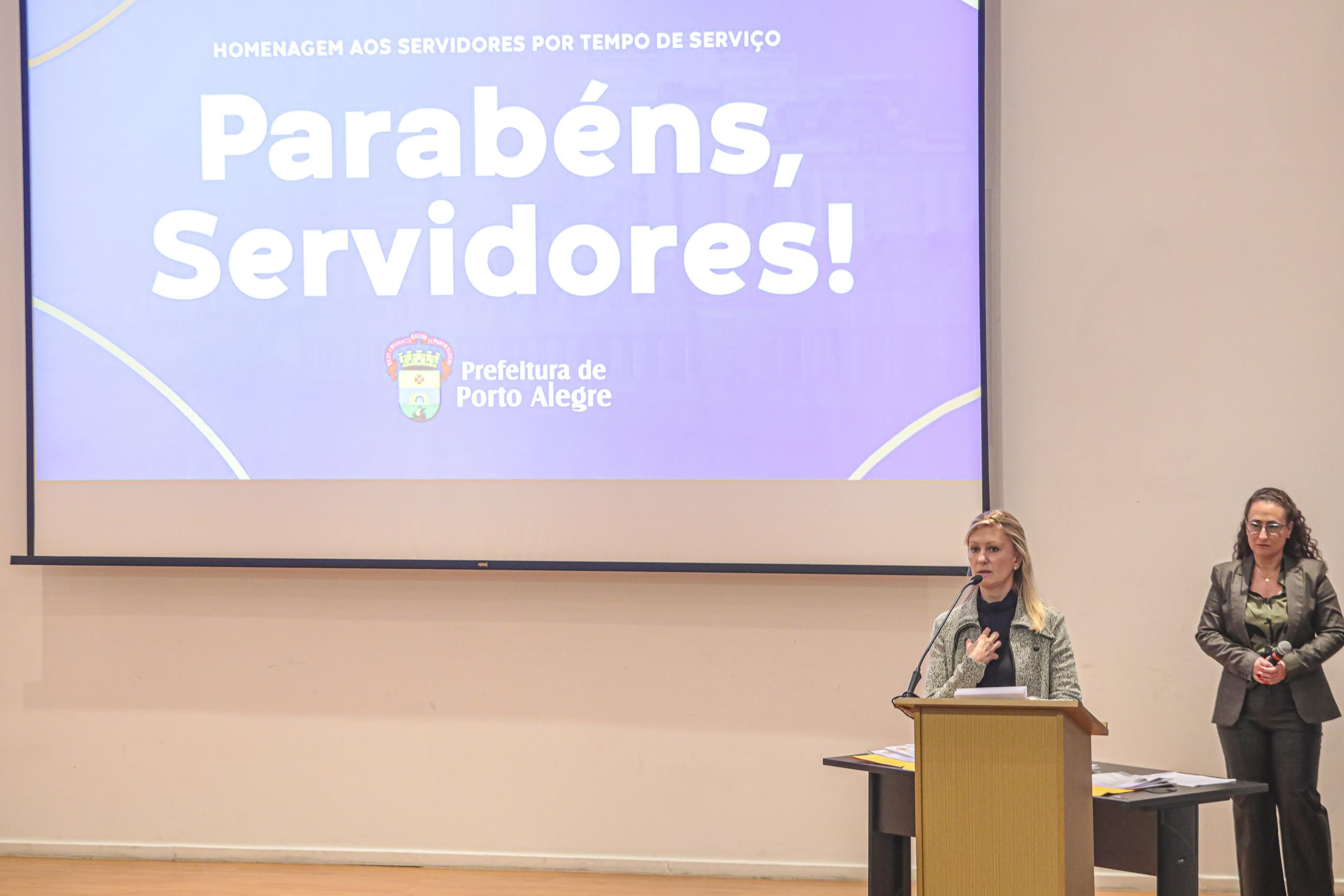 Porto Alegre, RS, Brasil, 31/10/2025: Em um evento que contou com a presença da vice-prefeita, Betina Worm, foi realizada na tarde desta sexta-feira (31), no auditório da Associação dos Auditores Fiscais da Receita Municipal de Porto Alegre (AIAMU), no bairro Centro Histórico, uma cerimônia para homenagear os servidores municipais pelo seu Tempo de Serviço. Foto: Alex Rocha/PMPA