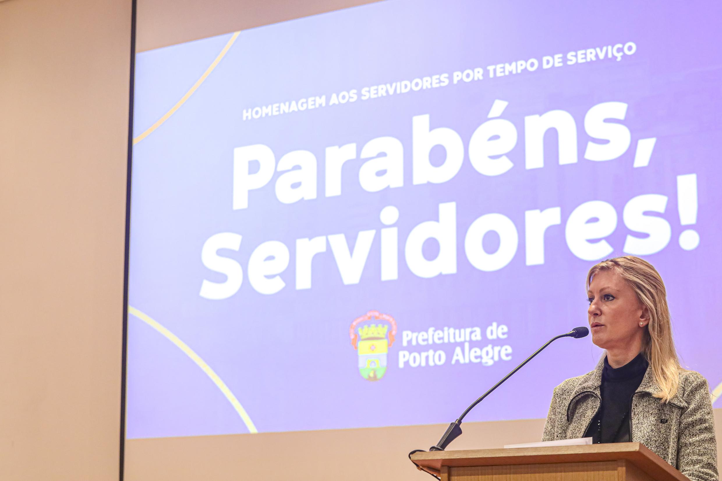 Porto Alegre, RS, Brasil, 31/10/2025: Em um evento que contou com a presença da vice-prefeita, Betina Worm, foi realizada na tarde desta sexta-feira (31), no auditório da Associação dos Auditores Fiscais da Receita Municipal de Porto Alegre (AIAMU), no bairro Centro Histórico, uma cerimônia para homenagear os servidores municipais pelo seu Tempo de Serviço. Foto: Alex Rocha/PMPA
