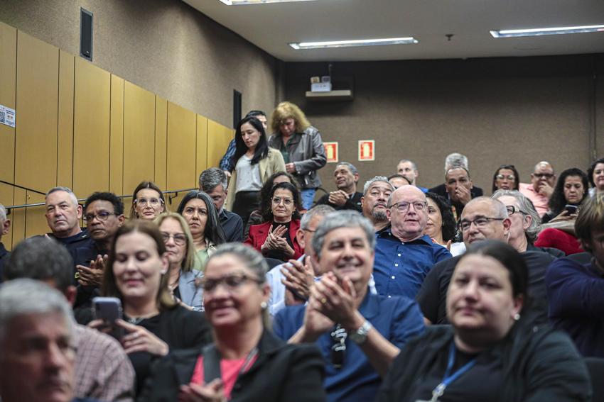 Porto Alegre, RS, Brasil, 31/10/2025: Em um evento que contou com a presença da vice-prefeita, Betina Worm, foi realizada na tarde desta sexta-feira (31), no auditório da Associação dos Auditores Fiscais da Receita Municipal de Porto Alegre (AIAMU), no bairro Centro Histórico, uma cerimônia para homenagear os servidores municipais pelo seu Tempo de Serviço. Foto: Alex Rocha/PMPA