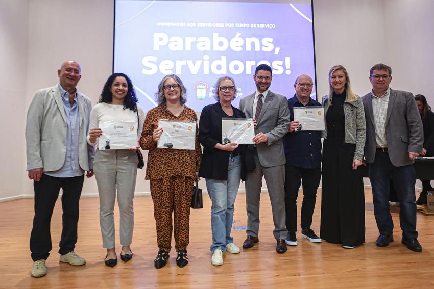 Porto Alegre, RS, Brasil, 31/10/2025: Em um evento que contou com a presença da vice-prefeita, Betina Worm, foi realizada na tarde desta sexta-feira (31), no auditório da Associação dos Auditores Fiscais da Receita Municipal de Porto Alegre (AIAMU), no bairro Centro Histórico, uma cerimônia para homenagear os servidores municipais pelo seu Tempo de Serviço. Foto: Alex Rocha/PMPA