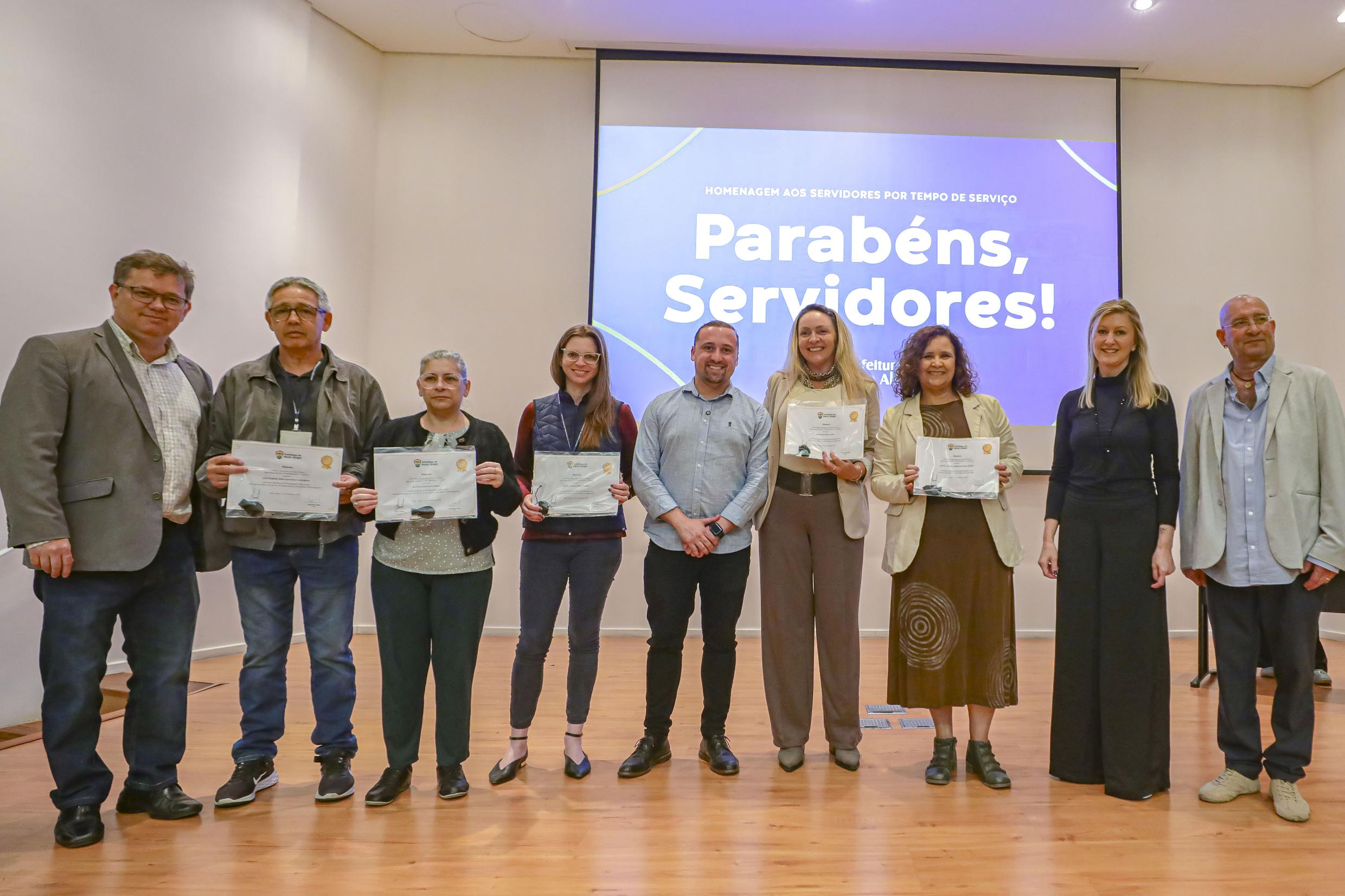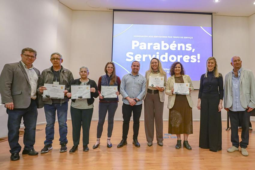 Porto Alegre, RS, Brasil, 31/10/2025: Em um evento que contou com a presença da vice-prefeita, Betina Worm, foi realizada na tarde desta sexta-feira (31), no auditório da Associação dos Auditores Fiscais da Receita Municipal de Porto Alegre (AIAMU), no bairro Centro Histórico, uma cerimônia para homenagear os servidores municipais pelo seu Tempo de Serviço. Foto: Alex Rocha/PMPA