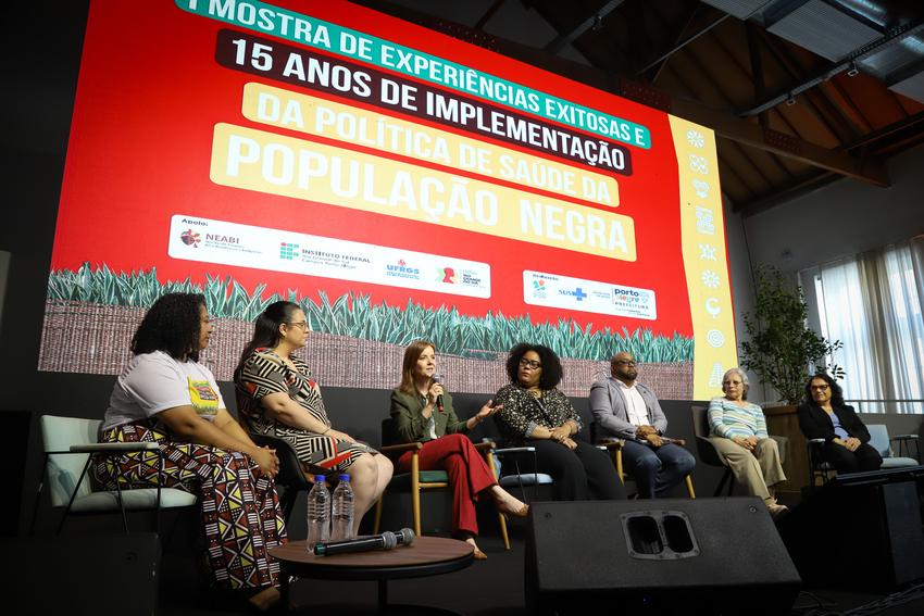 Na foto: Mesa de abertura com (esq. para dir.): coord. Políticas Públicas de Saúde CPPS)/DAPS/SMS, Gisele Martins Gomes, a dir.-adjunta DAPS, Caroline Ceolin, a secretária-adjunta, Jaqueline César Rocha, a RT das Política de Saúde da População Negra da SES RS, Francyne Silva, o representante da Coord. Nacional de Saúde da População Negra do Ministério da Saúde, Hilário Damásio e a Coord. do CMS, Maria Inês Flores e Coord. CoorSaúde UFRGS, Eloá Rossoni.