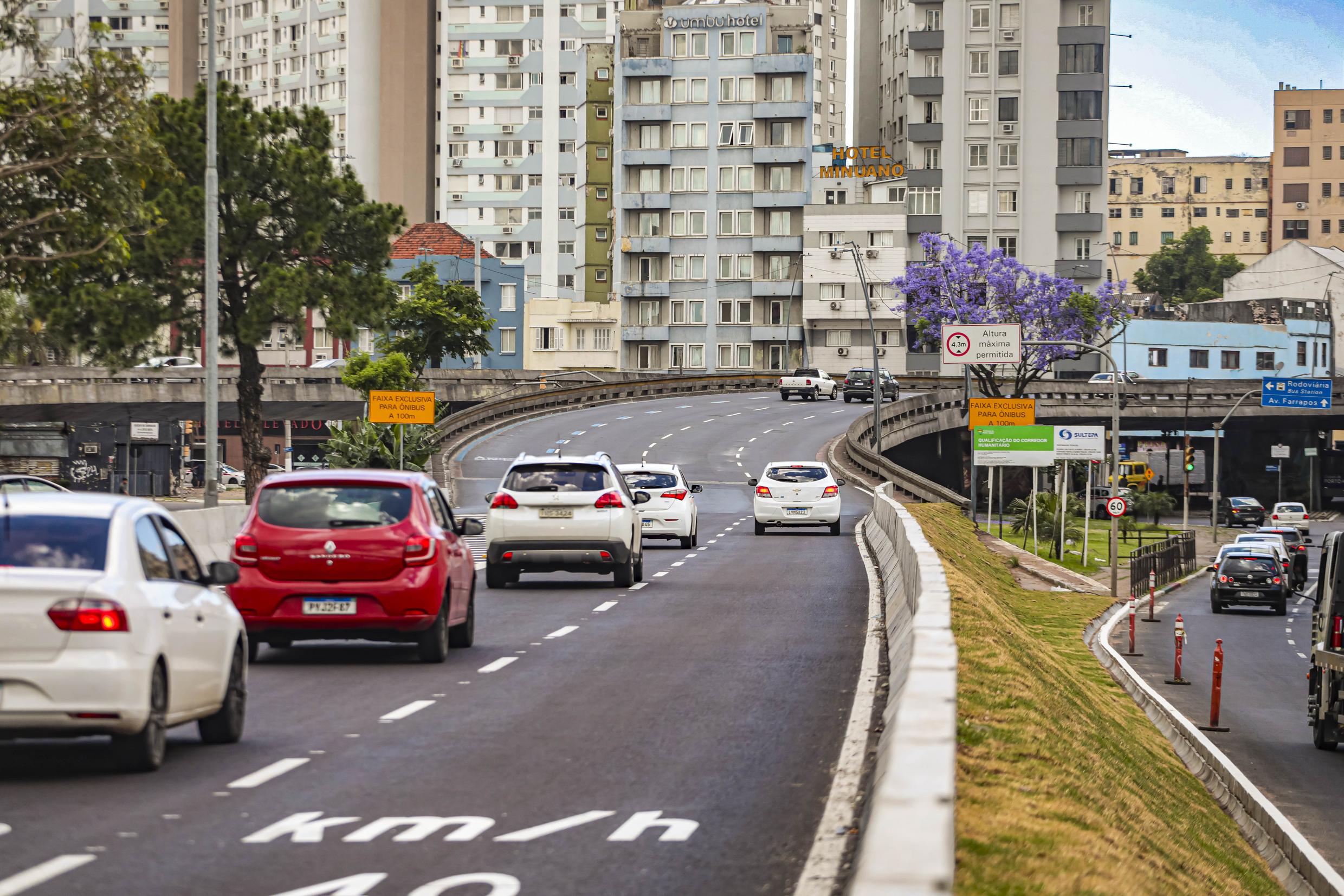 Porto Alegre, RS, Brasil, 22/9/2025: A Secretaria Municipal de Obras e Infraestrutura (Smoi) começou a instalação das contenções laterais da parte elevada do corredor humanitário, trecho que liga a avenida Castello Branco à Elevada da Conceição. Chamadas de barreiras New Jersey, as estruturas serão fixadas ao longo dos 400 metros de extensão do corredor. As barreiras são de concreto e servem para sinalizar o fluxo de veículos e proteger a via, além de impedir a travessia irregular de pedestres. Foto: Alex Rocha/PMPA