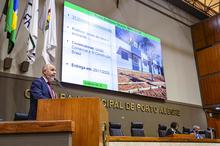Porto Alegre, RS, Brasil, 05/11/2025: O diretor-geral do Departamento Municipal de Habitação (Demhab), André Machado, apresentou, nesta quarta-feira, 5, um balanço das ações do Departamento Municipal de Habitação (Demhab) nos últimos cinco anos na Câmara Municipal. Foto: Alex Rocha/PMPA
