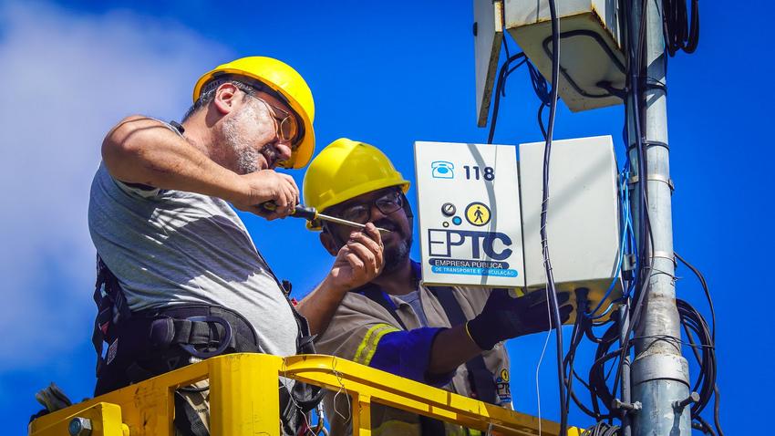Porto Alegre, RS, 7/11/2025: Técnicos da Empresa Pública de Transporte e Circulação (EPTC) trabalham na manutenção semafórica e substituição de cabos de energia de cobre furtados por cabos de alumínio. Após meses de espera devido à alta demanda em todo o país, que impactou o fornecimento do material, a EPTC recebeu um novo lote de 10 mil metros de cabos de alumínio. Além de causar transtornos à mobilidade urbana, como pane em cruzamentos e sérios riscos de acidentes, o furto de cabos de cobre exige custos elevados de reposição e mobiliza equipes técnicas para o restabelecimento do serviço, desviando recursos que poderiam ser aplicados em melhorias para a cidade. Foto: Gustavo Roth/EPTC/PMPA