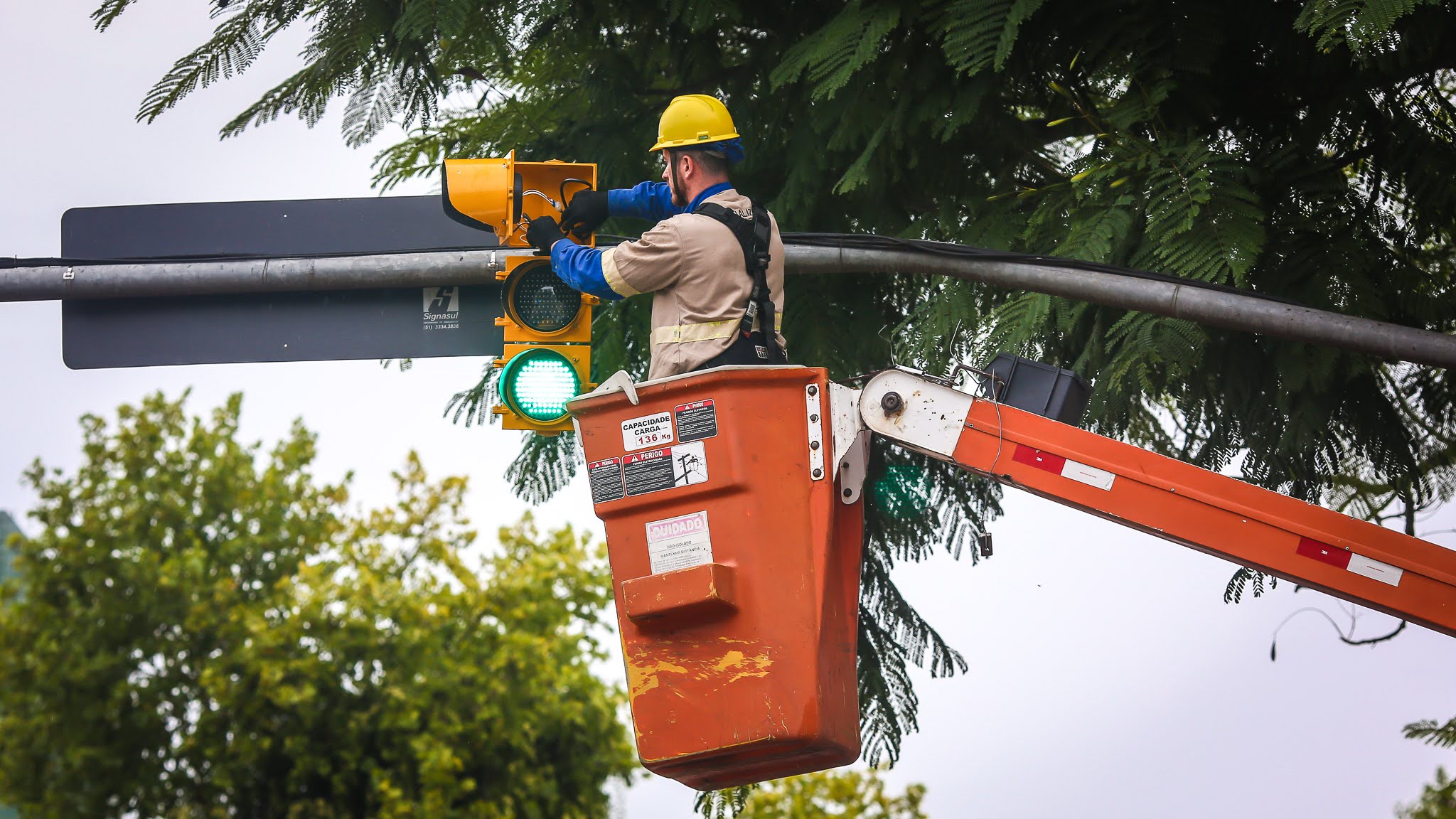 Porto Alegre, RS, 7/11/2025: Técnicos da Empresa Pública de Transporte e Circulação (EPTC) trabalham na manutenção semafórica e substituição de cabos de energia de cobre furtados por cabos de alumínio. Após meses de espera devido à alta demanda em todo o país, que impactou o fornecimento do material, a EPTC recebeu um novo lote de 10 mil metros de cabos de alumínio. Além de causar transtornos à mobilidade urbana, como pane em cruzamentos e sérios riscos de acidentes, o furto de cabos de cobre exige custos elevados de reposição e mobiliza equipes técnicas para o restabelecimento do serviço, desviando recursos que poderiam ser aplicados em melhorias para a cidade. Foto: Gustavo Roth/EPTC/PMPA