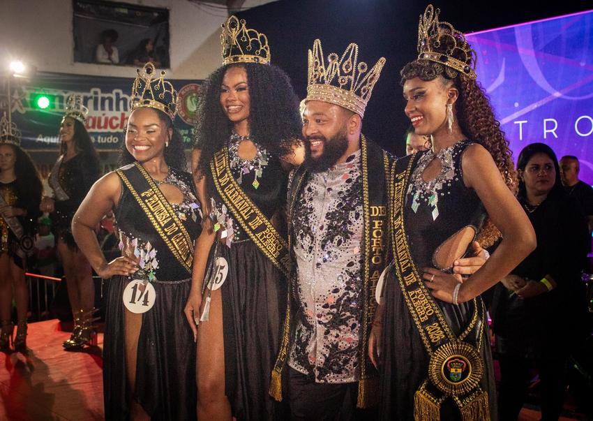 Porto Alegre, RS, Brasil, 08/10/2025: Na noite de sábado, 8, na Quadra da Escola Estado Maior da Restinga, foram escolhidas a Corte Oficial e a Corte da Diversidade do Carnaval 2026 de Porto Alegre. A Rainha do Carnaval de Porto Alegre 2026 é Kerolyn Jordana, da Praiana; a 1ª Princesa é Zamilla de Jesus, da Copacabana; e a 2ª Princesa é Carolina Ferreira, dos Fidalgos. O Rei Momo é Jefferson Amorim, que continuará no posto. Foto: André Duarte/Divulgação Uecegapa