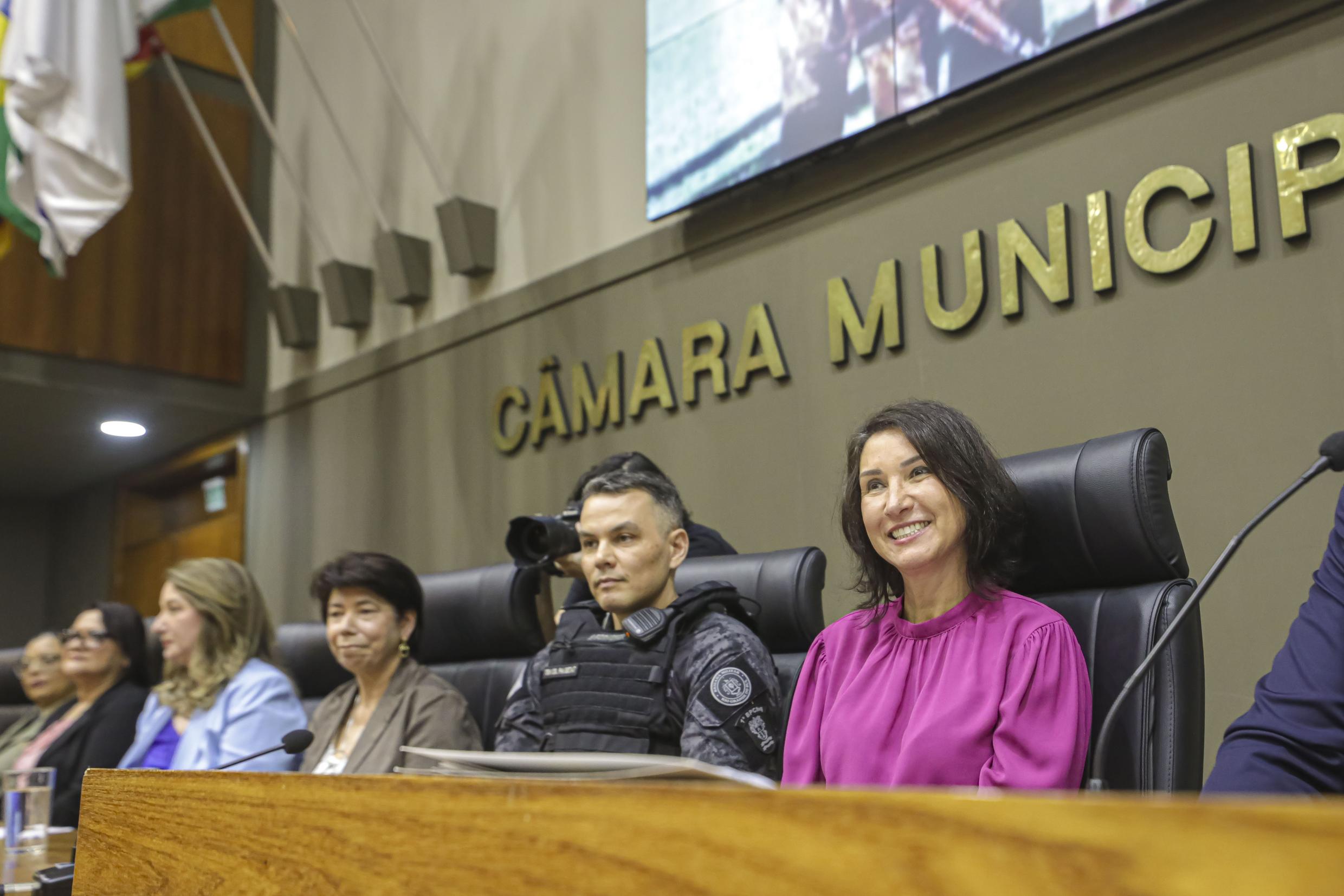 Porto Alegre, RS, Brasil, 10/11/2025: A prefeita em exercício, Comandante Nádia, participou, na tarde desta segunda-feira (10), da sessão plenária da Câmara Municipal de Vereadores (CMPA), em homenagem às primeiras militares femininas no então Batalhão de Choque (BPchq) da Brigada Militar, hoje 1º Batalhão de Operações Especiais (BOE). Foto: Alex Rocha/PMPA