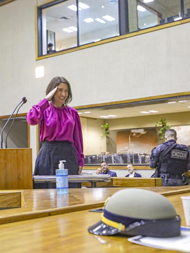 Porto Alegre, RS, Brasil, 10/11/2025: A prefeita em exercício, Comandante Nádia, participou, na tarde desta segunda-feira (10), da sessão plenária da Câmara Municipal de Vereadores (CMPA), em homenagem às primeiras militares femininas no então Batalhão de Choque (BPchq) da Brigada Militar, hoje 1º Batalhão de Operações Especiais (BOE). Foto: Alex Rocha/PMPA