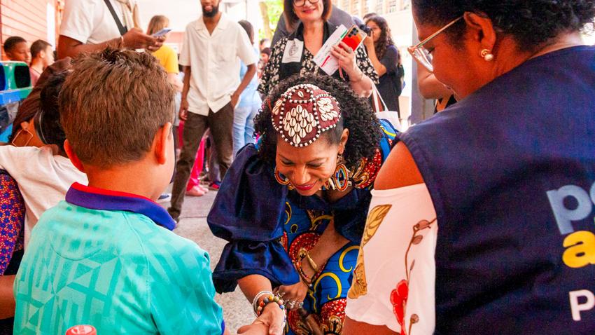 Porto Alegre, RS, Brasil - 12/11/2025: A Escola Municipal de Ensino Fundamental Heitor Villa-Lobos recebeu a visita da rainha Diambi Kabatusuila, do povo Bena Tshiyamba, da República Democrática do Congo. Durante a visita, a rainha conheceu os espaços do EEABI, os projetos desenvolvidos pelos estudantes e acompanhou uma apresentação de capoeira. Local: EMEF Heitor Villa Lobos: Av. Santo Dias da Silva, 460 - Lomba do Pinheiro. Foto: Henry Rodrigues/SMED/PMPA