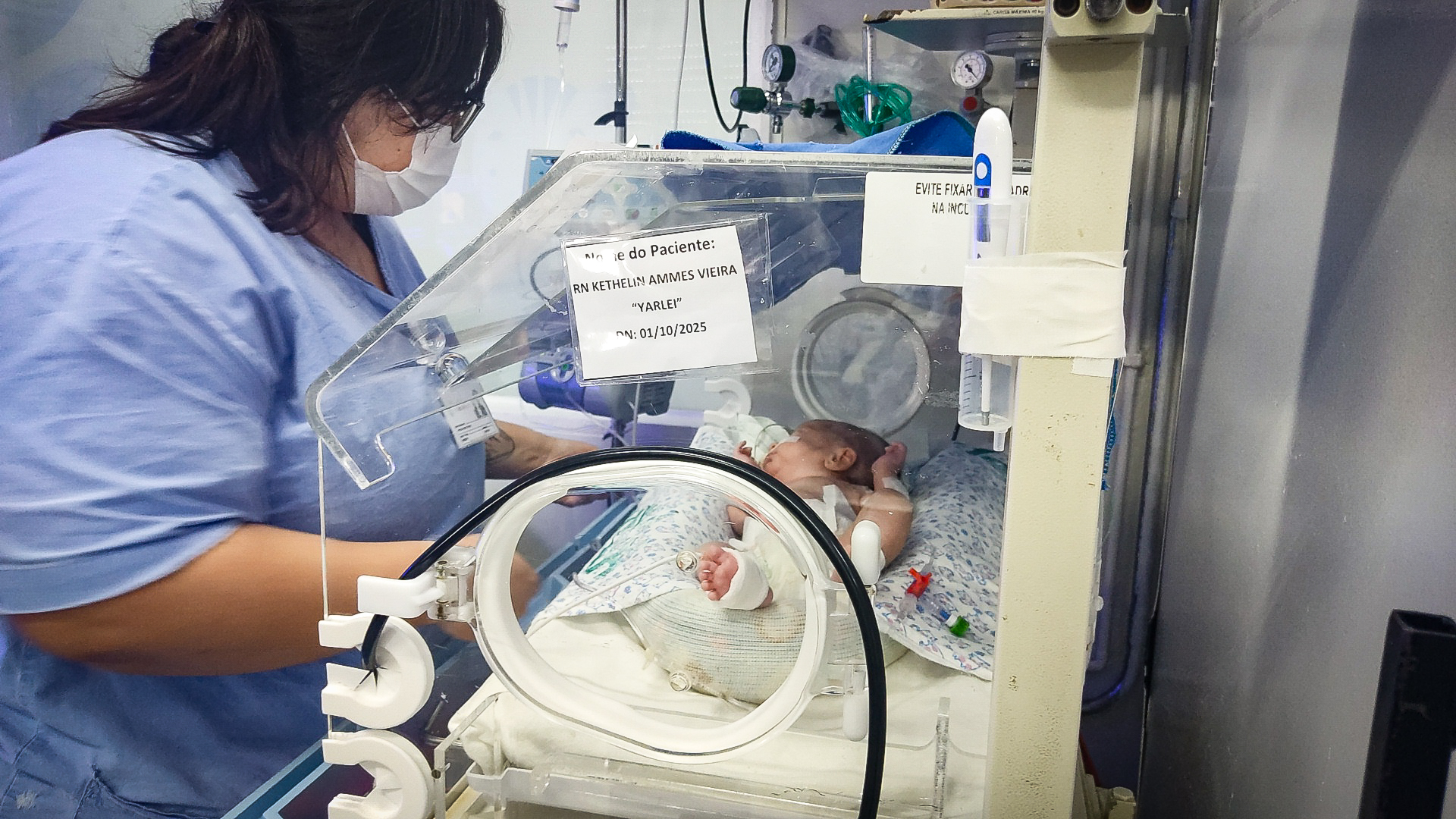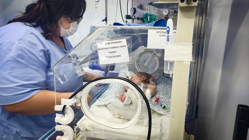 Na foto, Yarlei, que nasceu com 29 semanas e 1,4 quilo. O parto ocorreu às pressas no Hospital Materno-Infantil Presidente Vargas (HMIPV) para surpresa dos pais do bebê, Kethelin Ammes Vieira, 26 anos, e Yargo Ribeiro Teixeira. Foto: Georgia Moreira/Divulgação SMS/PMPA