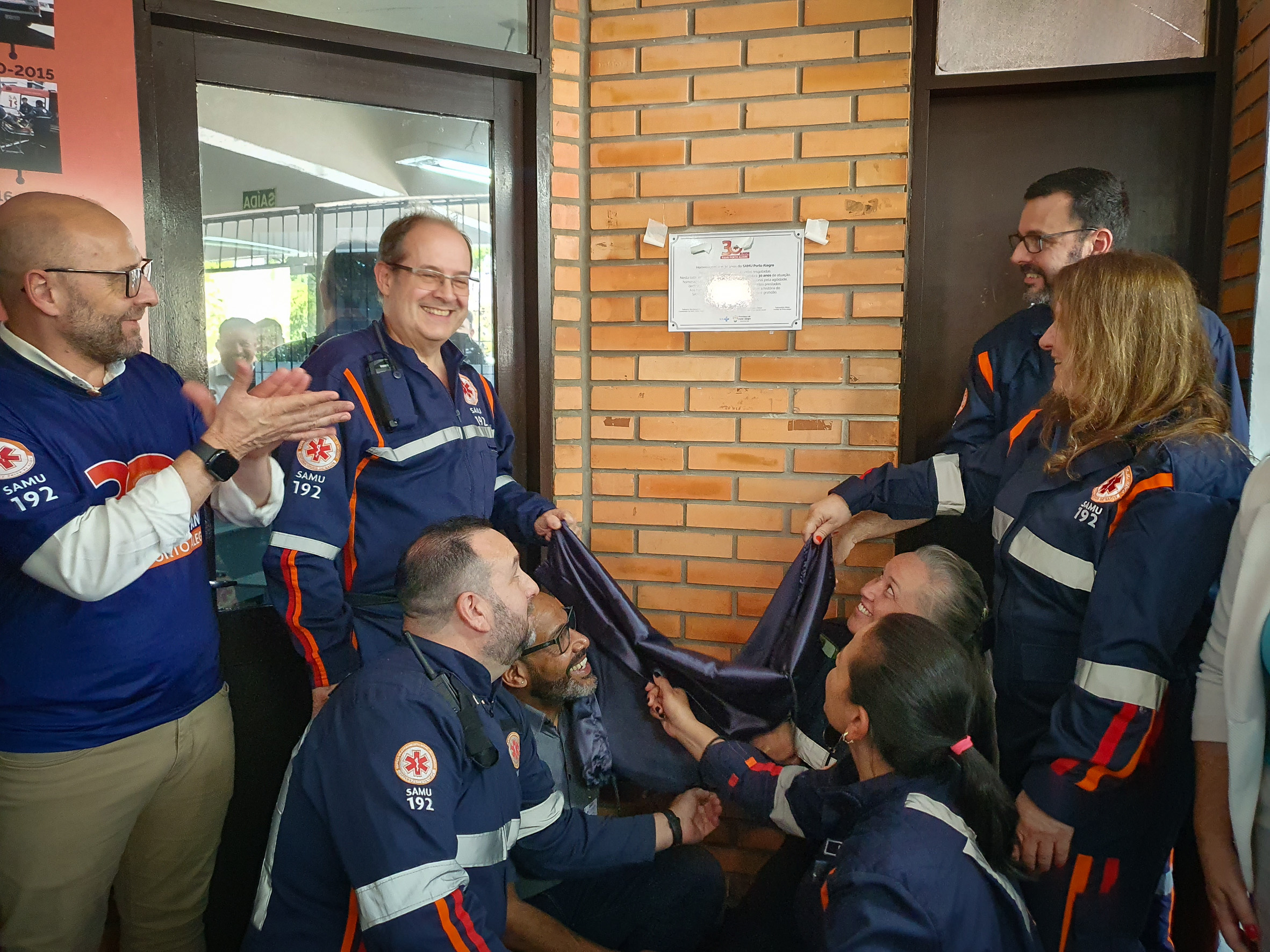Porto Alegre, RS, 14/11/2025. O Serviço de Atendimento Móvel de Urgência (Samu) de Porto Alegre completa 30 anos de atuação nesta sexta-feira, 14 de novembro. Para marcar a data a Secretarial Municipal de Saúde realizou o descerramento de placa comemorativa e do painel histórico das três décadas do serviço na Capital.