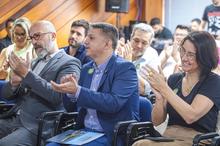 Porto Alegre, RS, Brasil, 14/11/2025: A prefeita em exercício, Comandante Nádia, participou, na manhã desta sexta-feira (14), no auditório do 18º andar do Centro Administrativo Municipal Guilherme Socias Villela (CAM) , do ato de sanção de lei do vereador Coronel Ustra. Foto: Alex Rocha/PMPA