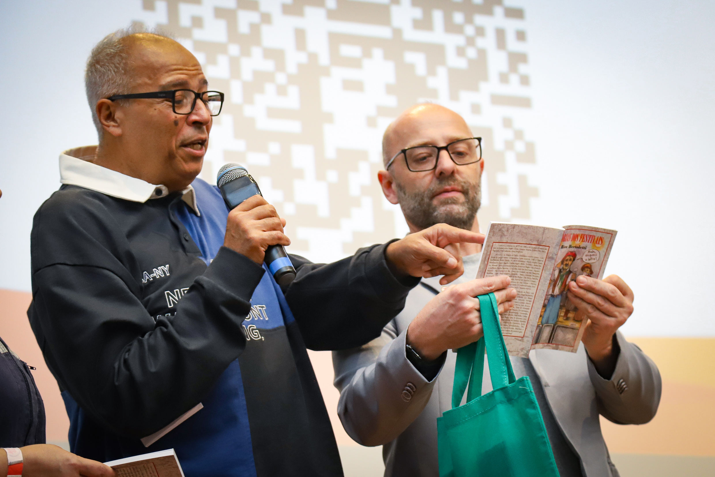 Porto Alegre, RS, 17/11/2025. O Serviço de Atendimento Móvel de Urgência (Samu) de Porto Alegre completa 30 anos de atuação em novembro. A data histórica é celebrada no dia 14. Nesta segunda-feira, 17, foi realizado o III Simpósio de Atendimento Pré-Hospitalar - 30 anos do Samu, no anfiteatro Carlos César de Albuquerque, do Hospital de Clínicas de Porto Alegre. Na foto o secretário da SMS, Fernando Ritter, e o paciente Carlos Henrique Bertoletti, atendido pelo Samu em 2024. Junto a eles, a equipe do Samu responsável por seu atendimento. Foto: Cristine Rochol/PMPA