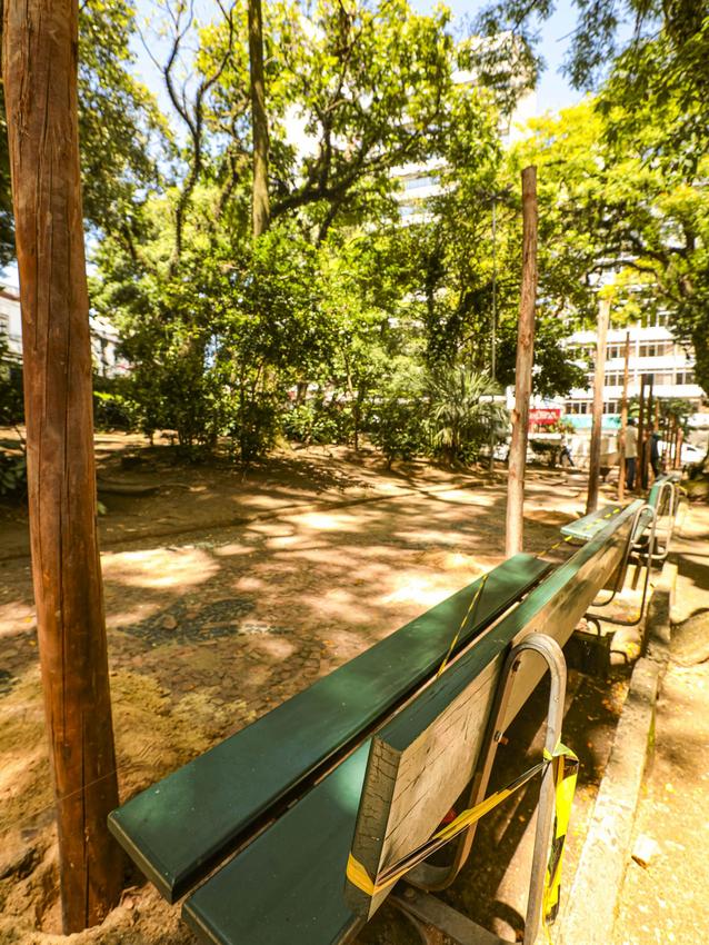 Porto Alegre, RS, Brasil, 18/11/2025: Começou nesta segunda-feira (17) o processo de revitalização da Praça Dom Feliciano. Entregue em 1809, está localizada entre as ruas Professor Annes Dias, dos Andradas e Senhor dos Passos e em frente à Santa Casa de Misericórdia, na capital gaúcha. Foto: Alex Rocha/PMPA