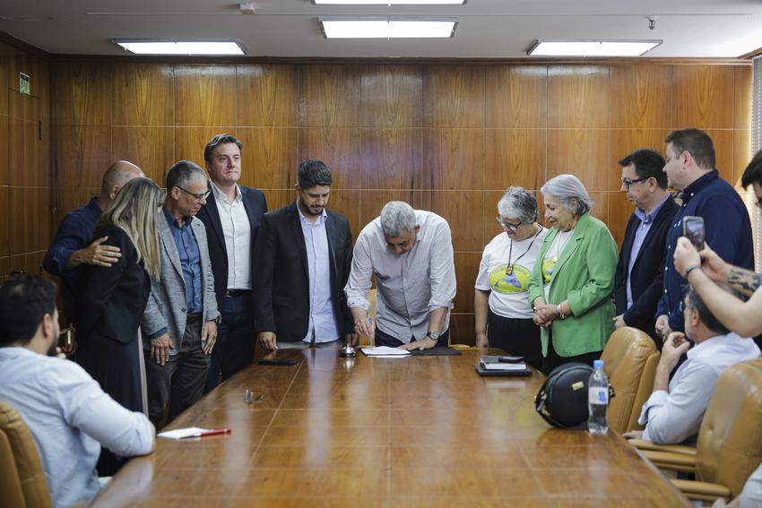 Porto Alegre, RS, Brasil - 24/11/2025 - Sanção de Lei que autoriza o Executivo Municipal a proceder à baixa dogravame no traçado viário da Avenida Guaíba, do nº 3.052 aonº 4.022, Vila dos Pescadores, no Bairro Assunção. Local: 17º andar - Sala de reuniões, Centro Administrativo Municipal. Fotos: Cesar Lopes/ PMPA