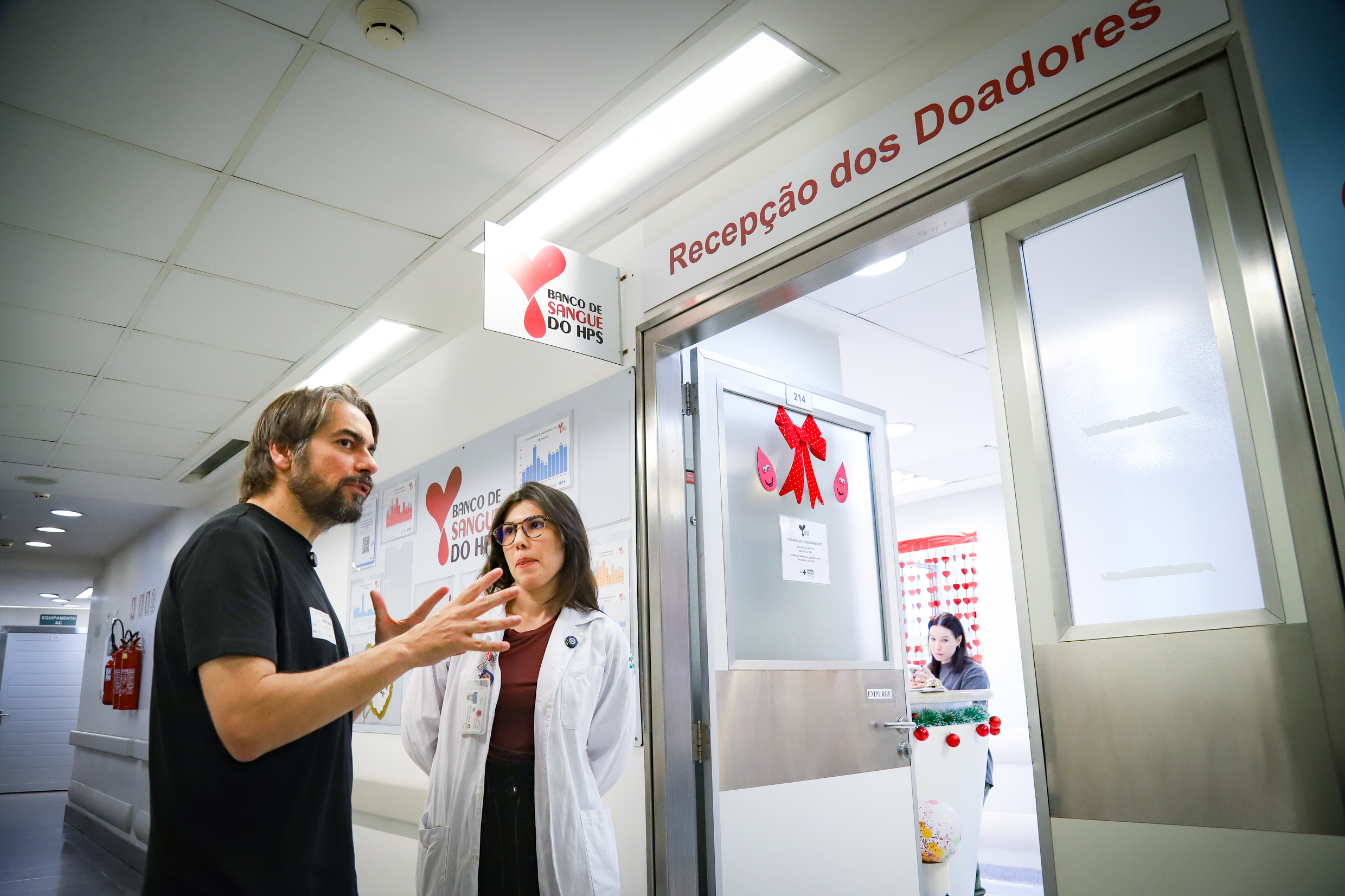 Porto Alegre, RS, 25/11/2025 Dia 25 de novembro é o dia do doador de sangue. O jornalista e comunicador, Luciano Potter, esteve no Banco de Sangue do HPS para sensibilizar a população sobre a importância de doar. A coordenadora do Banco de Sangue, Christina Fiorini, apresentou o serviço. Foto: Cristine Rochol/PMPA