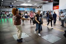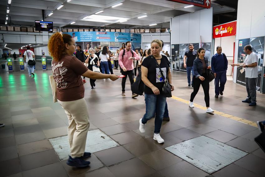 Porto Alegre, RS, 01/12/2025 O mês de dezembro é dedicado à conscientização, prevenção e enfrentamento ao HIV/Aids. A programação organizada pela SMS começou nesta segunda-feira, 1º, Dia Mundial de Combate ao HIV. Pela manhã, nas estações Mercado, Rodoviária e Farrapos da Trensurb, profissionais de saúde abordaram usuários com orientações, distribuição de autotestes, preservativos, gel lubrificante e folders. Foto: Cristine Rochol/PMPA